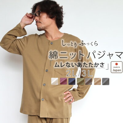 メーカー直販 生地 スムースニット 組成 綿100% コットン100% アイテム パジャマ サイズ メンズ 2L 3L 仕様 長袖 上下セット 襟無し 前開き ポケット付 前立て(社会の窓)付き カラー アイボリー、ピンク、ネイビー、カーキ、ブラウン、ベージュ、グレー 寸法変化率 タテ-4% ヨコ-6% 生産国 日本製 ▽他のパジャマを見る 安心のお買い物のためにあったか 冬 パジャマ 襟無し 前開き メンズ ムレない あたたか 秋冬用 ニット 綿100%ニットのメンズパジャマ。